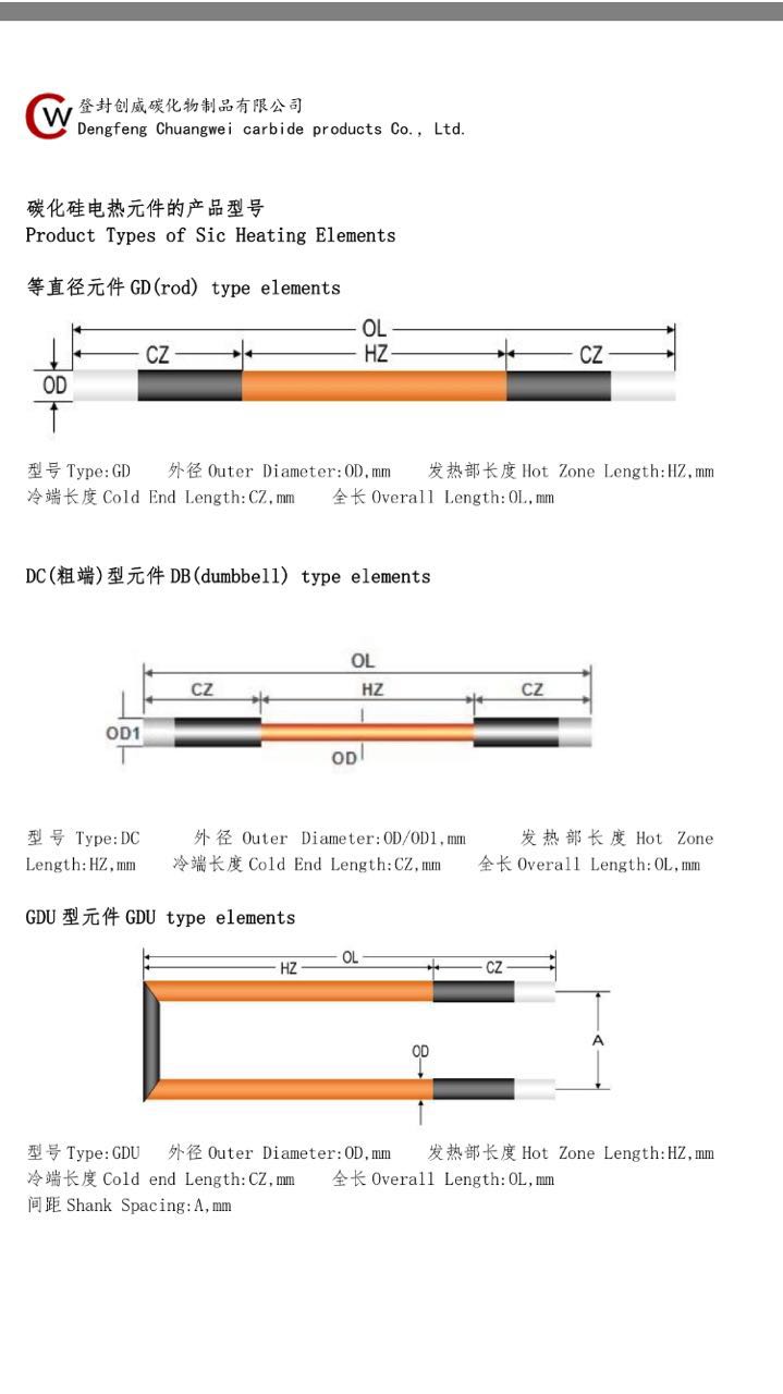 硅碳棒是由高纯度绿碳化硅、碳黑等经高温硅化再结晶制成的高温电热元件,其碳化硅含量在99%以上,所以它具有与碳化硅基本相同的物理化学性质。与其他金属电加热元件相比,它具有以下独特优点:耐酸性强,抗氧化能力强,表面负荷密度比金属电热元件大,升温快,热效率高,耐急热急冷性好,线膨胀系数小,热传导率高,使用温度高,寿命长。在空气中使用,棒体表面温度可达1520℃,连续使用寿命可达2000小时以上。在使用时电阻值接近的棒应装在同一温区,通常情况下,阻值误差应该在0.2左右。为了检验每支是否工作,通电时可用电流表逐一测定电流,同一区域在相等的电压下要求电流相近,偏差不超出10%,如果个别电流太大就说明这支的电阻太小。如果测试发现电流太小,说明不是阻值太大就是按触不良。没有电流通过说明元件已断,应更换阻值接近的新棒。