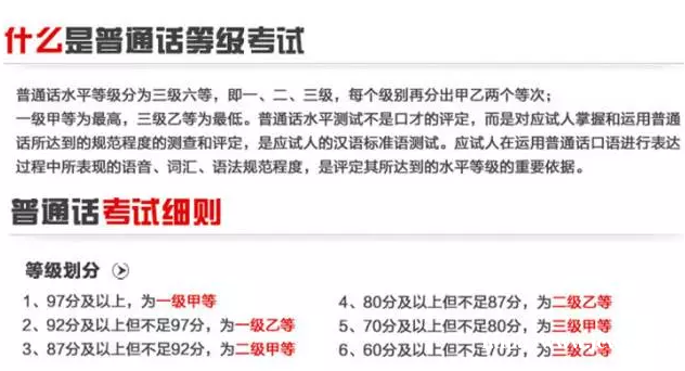 普通话水平测试(PSC:PUTONGHUA SHUIPING CESHI)是对应试人运用普通话的规范程度的口语考试。全部测试内容均以口头方式进行。普通话水平等级分为三级六等,即一、二、三级,每个级别再分出甲乙两个等次;一级甲等为最高,三级乙等为最低。